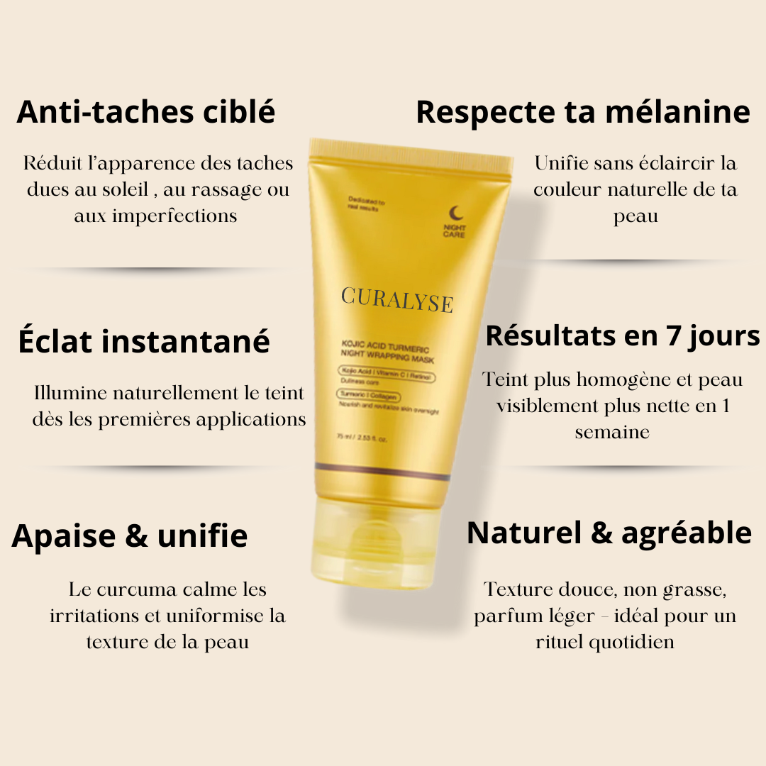 Curalyse agit pendant que vous dormez : il rééquilibre votre peau, apaise les irritations et aide à estomper progressivement les taches. Sa formule douce et non comédogène hydrate intensément sans obstruer les pores, pour une peau plus lumineuse au réveil.